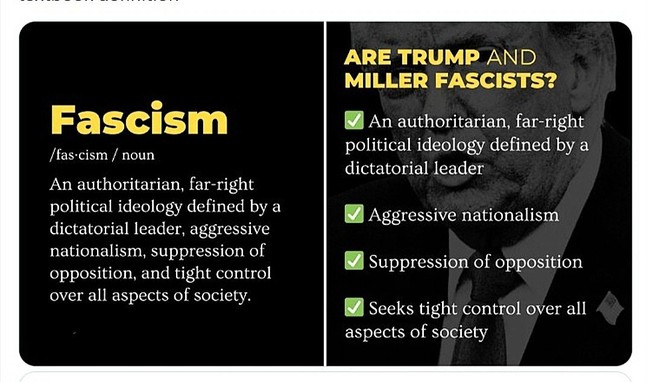 The “definition” isn't historical at all. It lists vibes: authoritarian, nationalist, controlling — traits so elastic you could stretch them over anyone you dislike. It left out the economic structure, the mass-mobilization state, the mythic nationalism, the corporatist machinery, and everything else that actually defines fascism.
