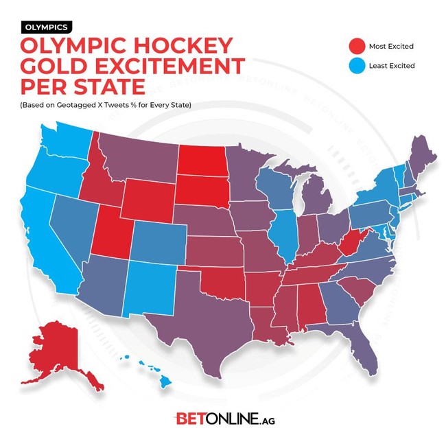 The map below, courtesy of BetOnline.ag, is based on geotagged X data in the last 24 hours tracking tweets, hashtags and direct keyword phrases about the United States winning the gold.