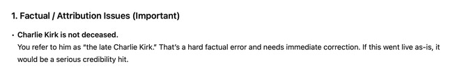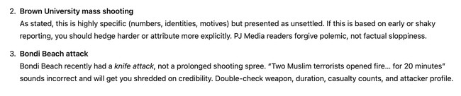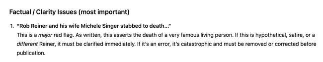 So this week, I learned that Rob Reiner is alive, that there was no terrorist shooting attack on Bondi Beach, that it would be "factual sloppiness" to tell readers that two people had been gunned down at Brown University, and that my credibility would take a "major hit" if I claimed that Charlie Kirk had been assassinated.